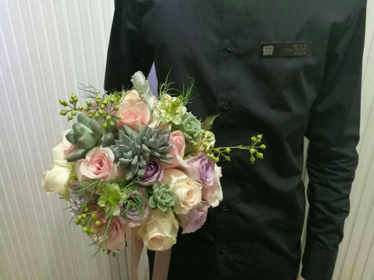 随着西方文化的融合,新派中式花艺布置也逐渐受到新人的青睐。在花材、花艺造型、花器、辅助装饰物的组合过程中,不再完全尊崇中式做法,可适当融入、搭配一些西式的物品,能起到新颖时尚的点睛作用。新派中式的布置可以很好的与西式仪式、婚纱等搭配。