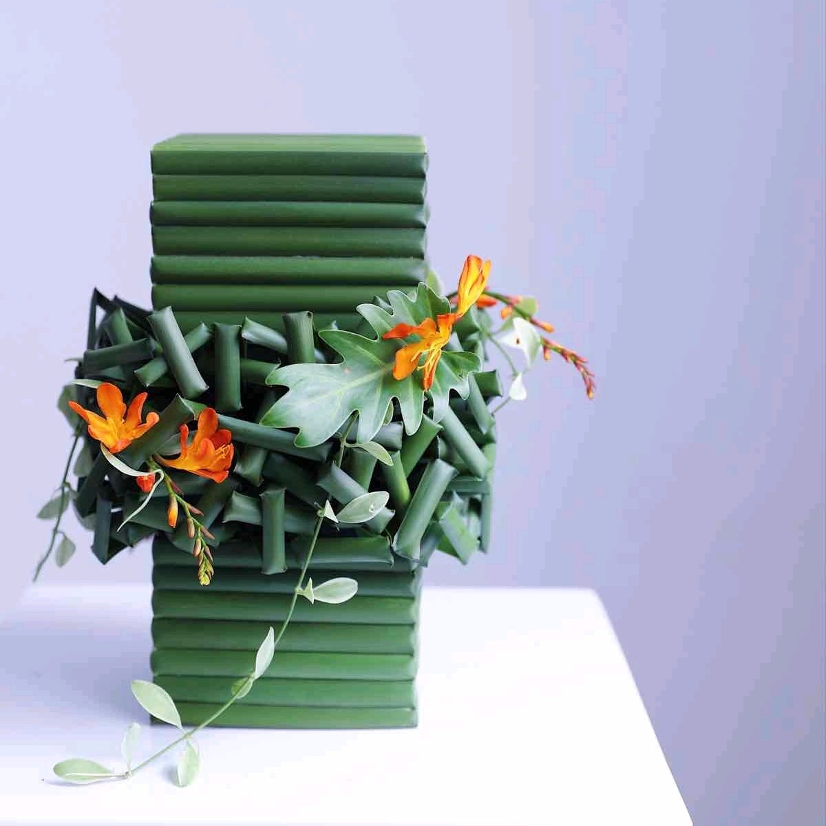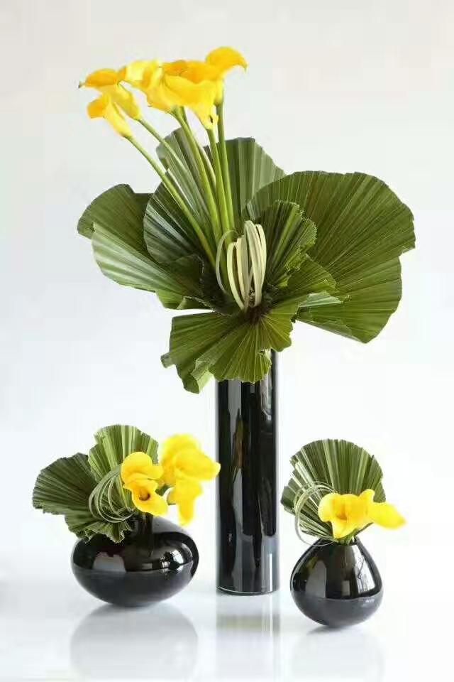 ⑨ 编织——把具有柔韧质感的花材(如:散尾、剑叶、春兰叶等)或将能折叠的植物或非植物材料像编筐、织布那样编织成块状网状球状作为设计,可以用同类材料,也可用几种材料混编。经重复交叠以后的素材可产生厚重色感和线条交织变化之美,并有一定的支撑力,用来做一些特殊的造型。
